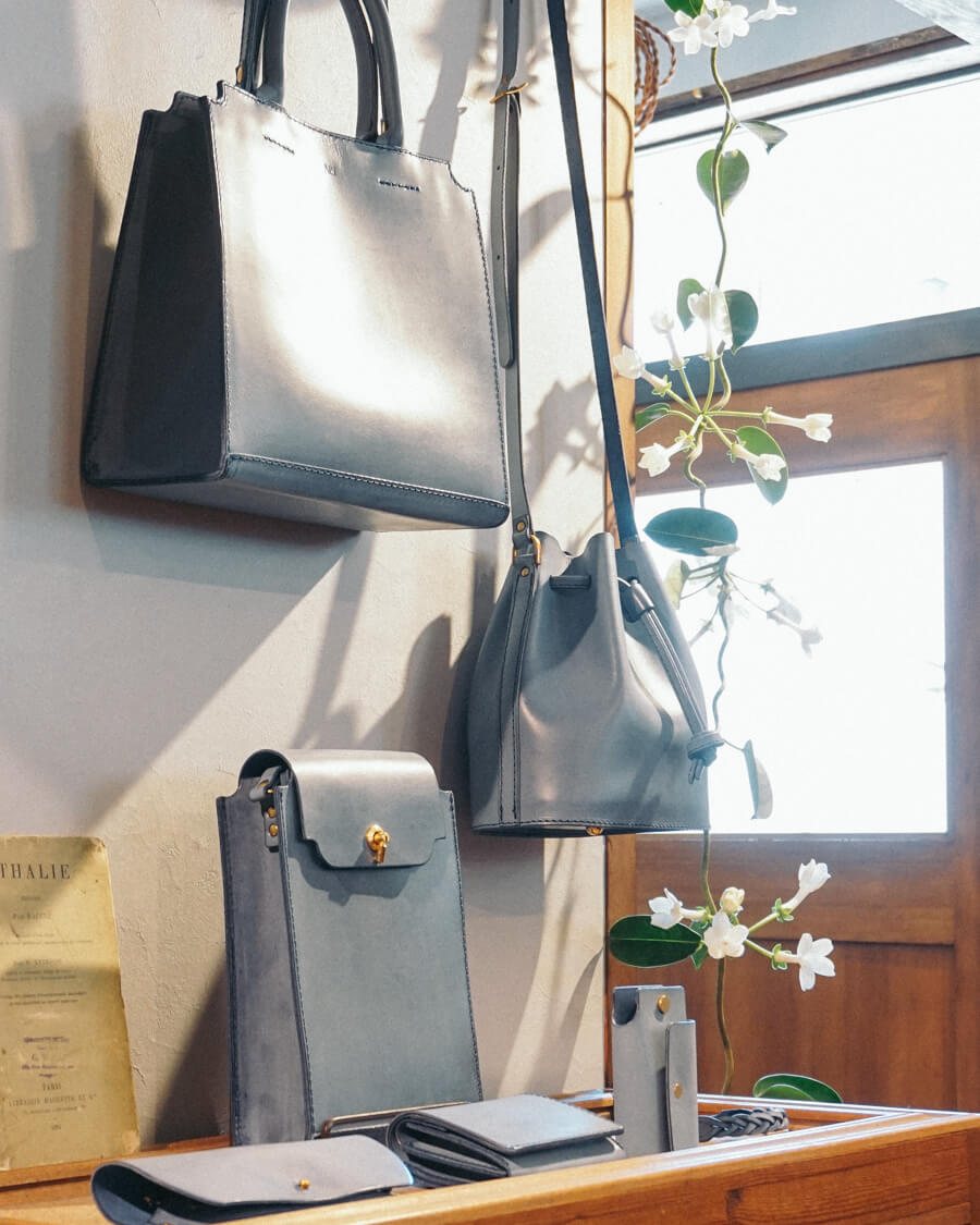 定番カラーの新作を含めたバッグや革小物が並びます